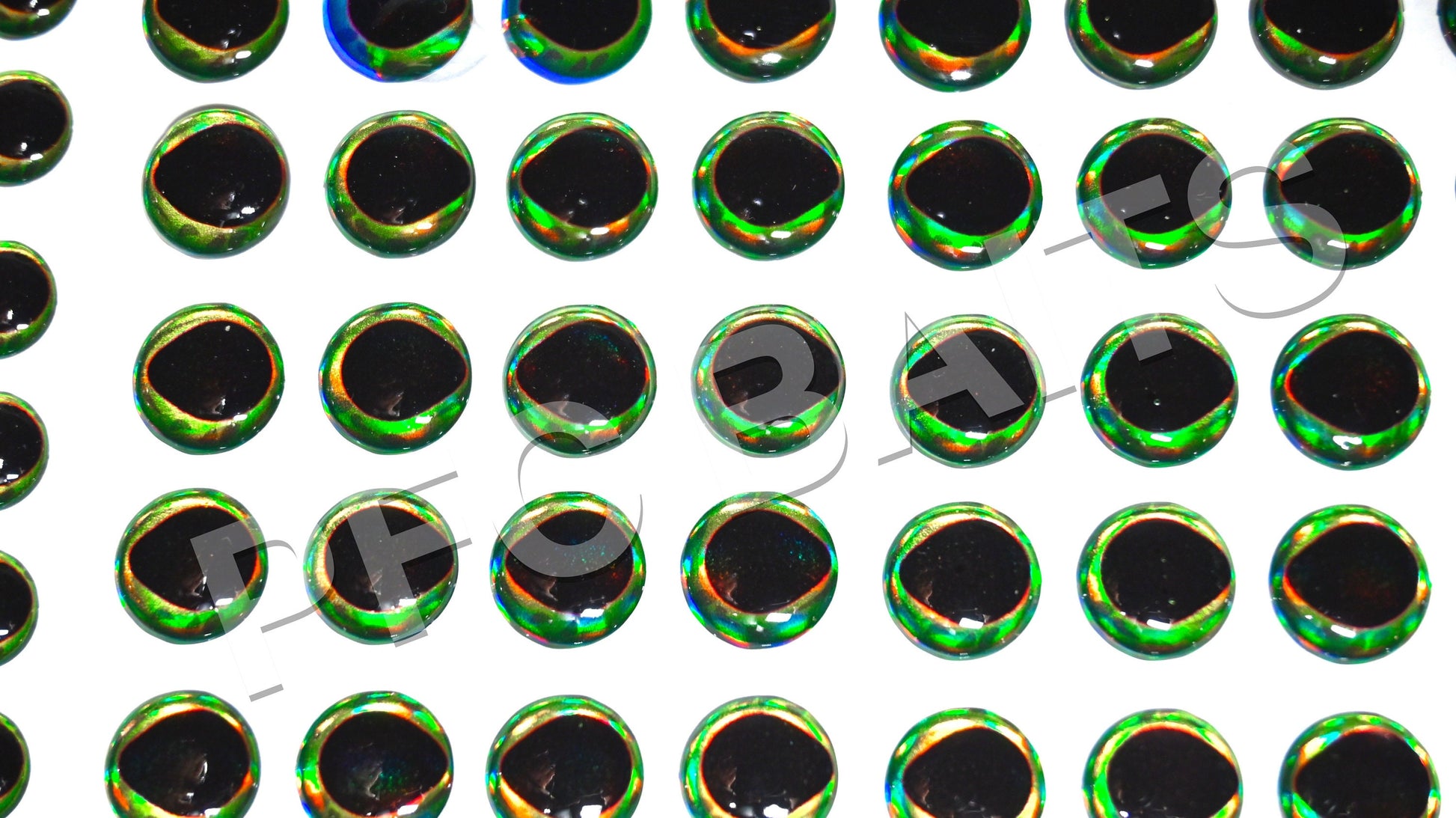 Our eyes are used using holographic backing. This backing produces a rainbow hued reflection which changes with the angle of the light.