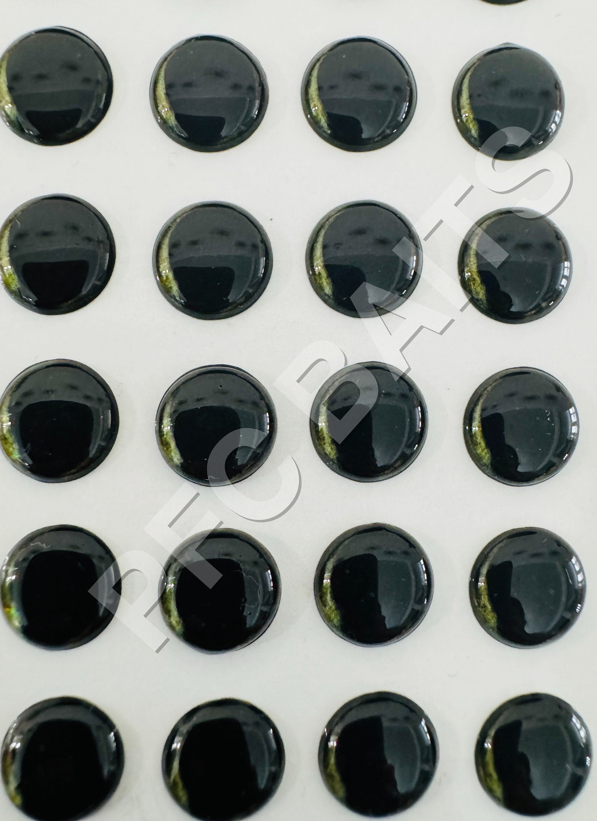 Our eyes are used using holographic backing. This backing produces a rainbow hued reflection which changes with the angle of the light.