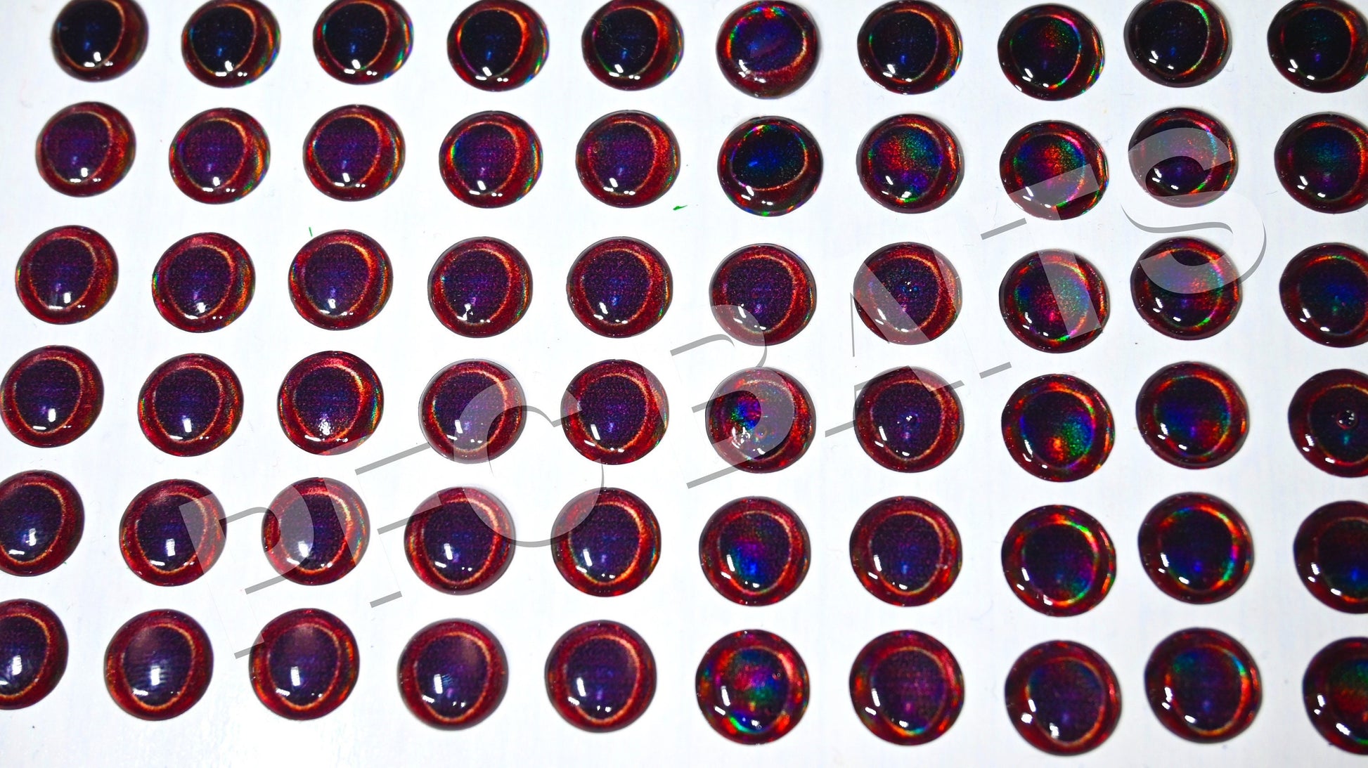 Our eyes are used using holographic backing. This backing produces a rainbow hued reflection which changes with the angle of the light.